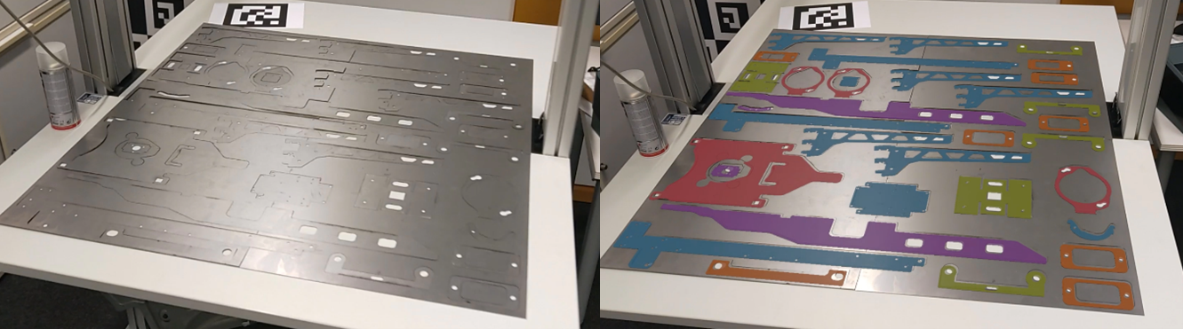 Using AR glasses, ARRANGE recognizes real-world objects and automatically assigns them to different orders or customers. Colored overlays guide the user: blue parts go to customer A, yellow to customer B. The solution is always right in front of their eyes.